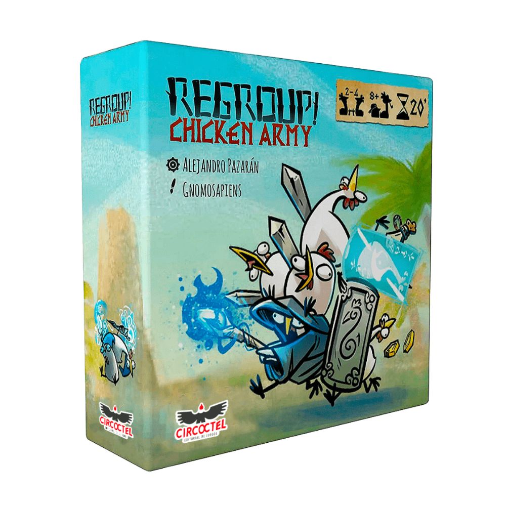 En Regroup! Chicken Army debes liderar un ejército de pollos guerreros y pollos magos, organizándolos cuidadosamente en tu “rejilla militar”. En cada turno eliges una carta para añadir al ejército, combinando ataques y defensas — ya sean físicos o mágicos — intentando superar a los ejércitos rivales. Al final de la ronda, los combates determinan quién resiste más. Es un juego rápido, dinámico y divertido, lleno de humor y tensión, ideal para quienes buscan desafíos ligeros en pocas rondas.